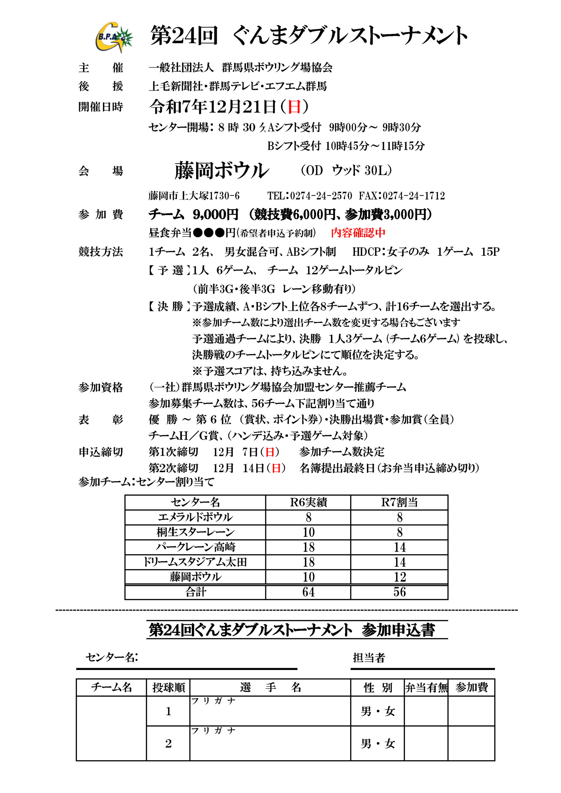 HOME > 大会概要 > 大会概要 第24回 ぐんまダブルストーナメント 開催要項 2025年10月23日 ボウリング場によって、予選会の有無、参加枠が異なりますので、加盟各ボウリング場へご確認の上お申し込みください。 パークレーン高崎は募集を終了いたしました。 <要項PDF> Twitter Share LINE -大会概要