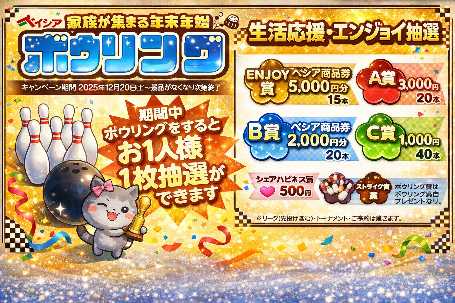 HOME > キャンペーン > キャンペーン 年末年始 × 生活応援 エンジョイ抽選 キャンペーン! 2025年12月19日 12月20日から桐生スターレーン エメラルドボウル パークレーン高崎 藤岡ボウル ドリームスタジアム太田 で開催! Twitter Share LINE -キャンペーン