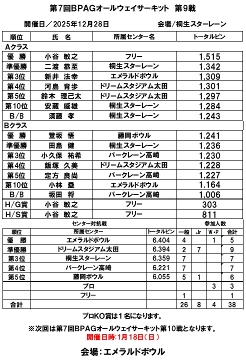 Aクラスでは小谷敏之選手(フリー)が、Bクラスでは登坂悟選手(藤岡ボウル)が優勝されました。
