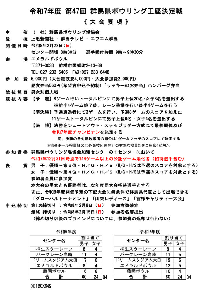 HOME > 大会概要 > 大会概要 令和7年度 第47回 群馬県ボウリング王座決定戦 要項 オイルパタン 2026年2月7日 参加資格は群馬県ボウリング場協会加盟の所属のボウリング場において、2025年の公認ゲーム数144ゲーム以上で各ボウリング場参加枠のアベレージ上位順になります。詳細は所属のボウリング場にお問い合わせください。 Twitter Share LINE -大会概要