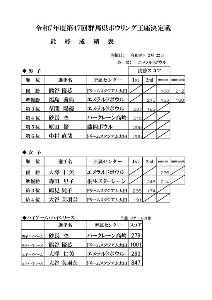 HOME > 大会概要 > 大会概要 令和7年度群馬県ボウリング王座決定戦 2026年2月23日 2月22日(日)エメラルドボウルにて「令和7年度群馬県ボウリング王座決定戦」が行われました。 成績並びに入賞者写真をUP致します。 Twitter Share LINE -大会概要